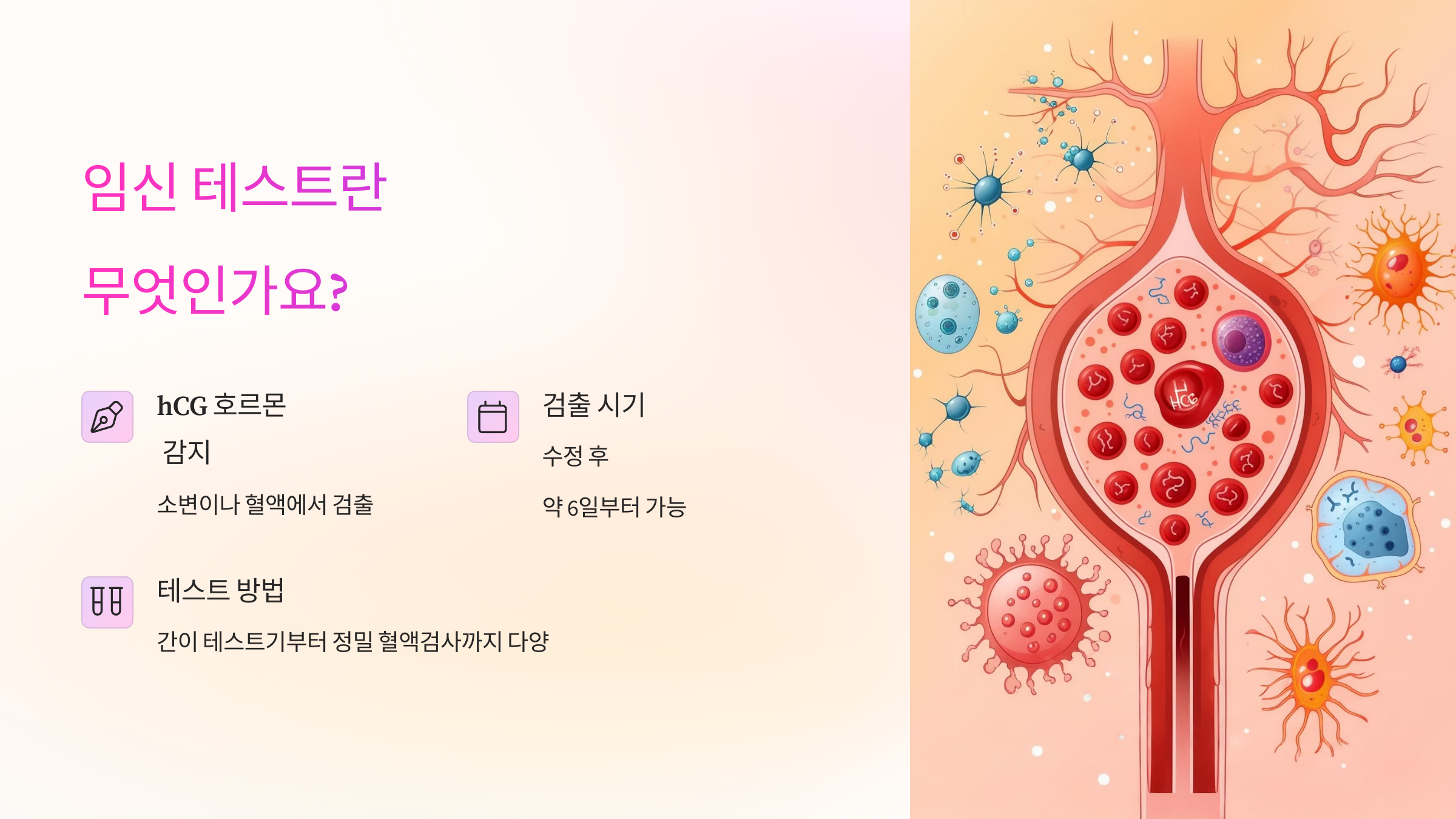 임신 테스트는 여성의 소변이나 혈액 속에서 인간 융모성 생식선 자극 호르몬(hCG)을 감지하여 임신 여부를 확인하는 과정이에요. 이 호르몬은 수정란이 자궁에 착상되면서 분비되기 시작하는데요, 일반적으로 수정 후 약 6일 정도부터 검출되기 시작해요. 집에서 사용하는 간이 테스트기부터, 병원에서 시행하는 정밀 혈액검사까지 방법은 다양합니다. 특히, 조기 발견이 가능한 덕분에 많은 분들이 초기 증상만으로도 빠르게 테스트를 시도하곤 하죠.