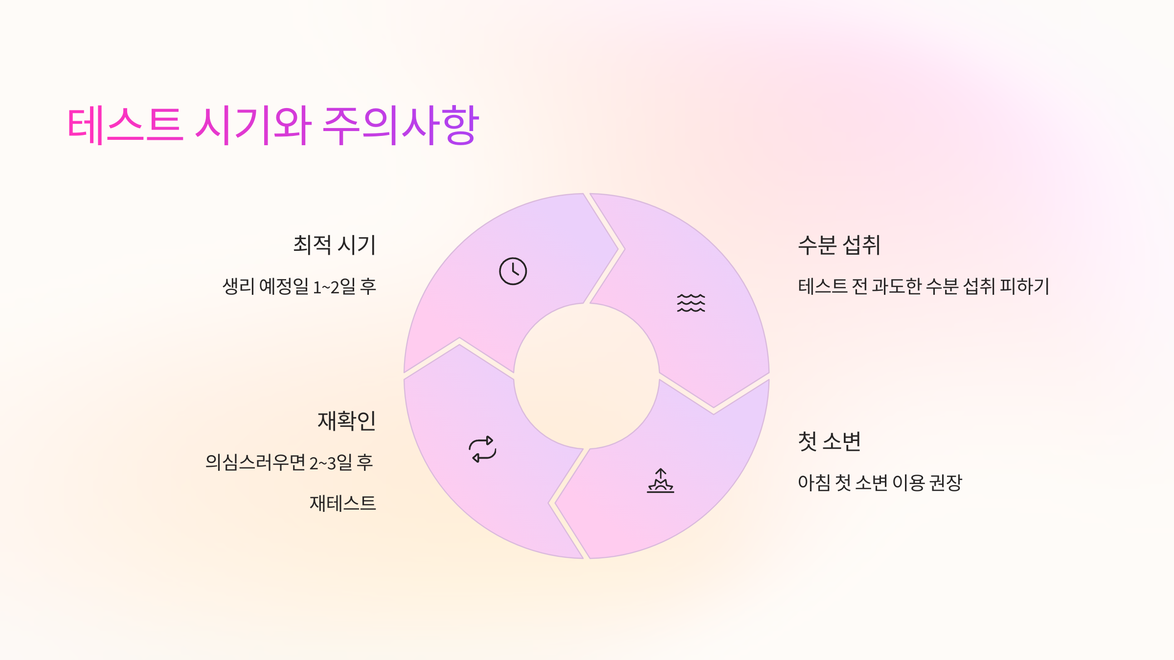임신 테스트는 시기가 정말 중요해요. 보통 생리 예정일이 지나고 1~2일 후에 시행하는 것이 가장 정확합니다. 너무 빨리 테스트하면 hCG 호르몬 수치가 낮아 정확한 결과를 얻기 어렵거든요. 또한 테스트 전날 과도한 수분 섭취를 피하는 것도 중요해요. 소변이 묽어지면 검사 결과가 흐릿하게 나올 수 있으니까요. 가능하면 아침 첫 소변을 이용하는 걸 추천드려요!