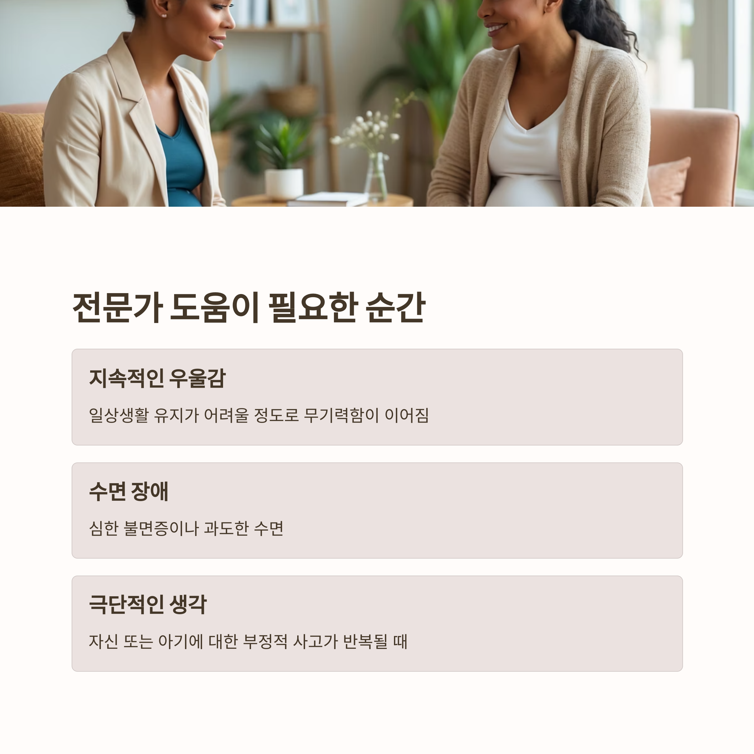 | 극단적인 생각 | 자신 또는 아기에 대한 부정적 사고가 반복될 때 |
