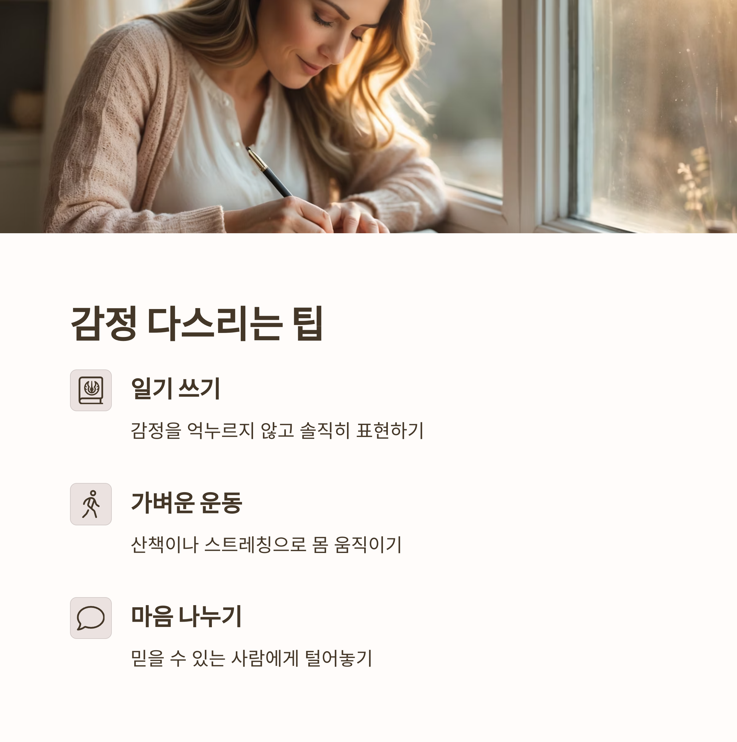 그렇다면 이런 감정들을 어떻게 다스릴 수 있을까요? 저에게 도움이 됐던 일상 속 실천 방법들을 공유해볼게요.