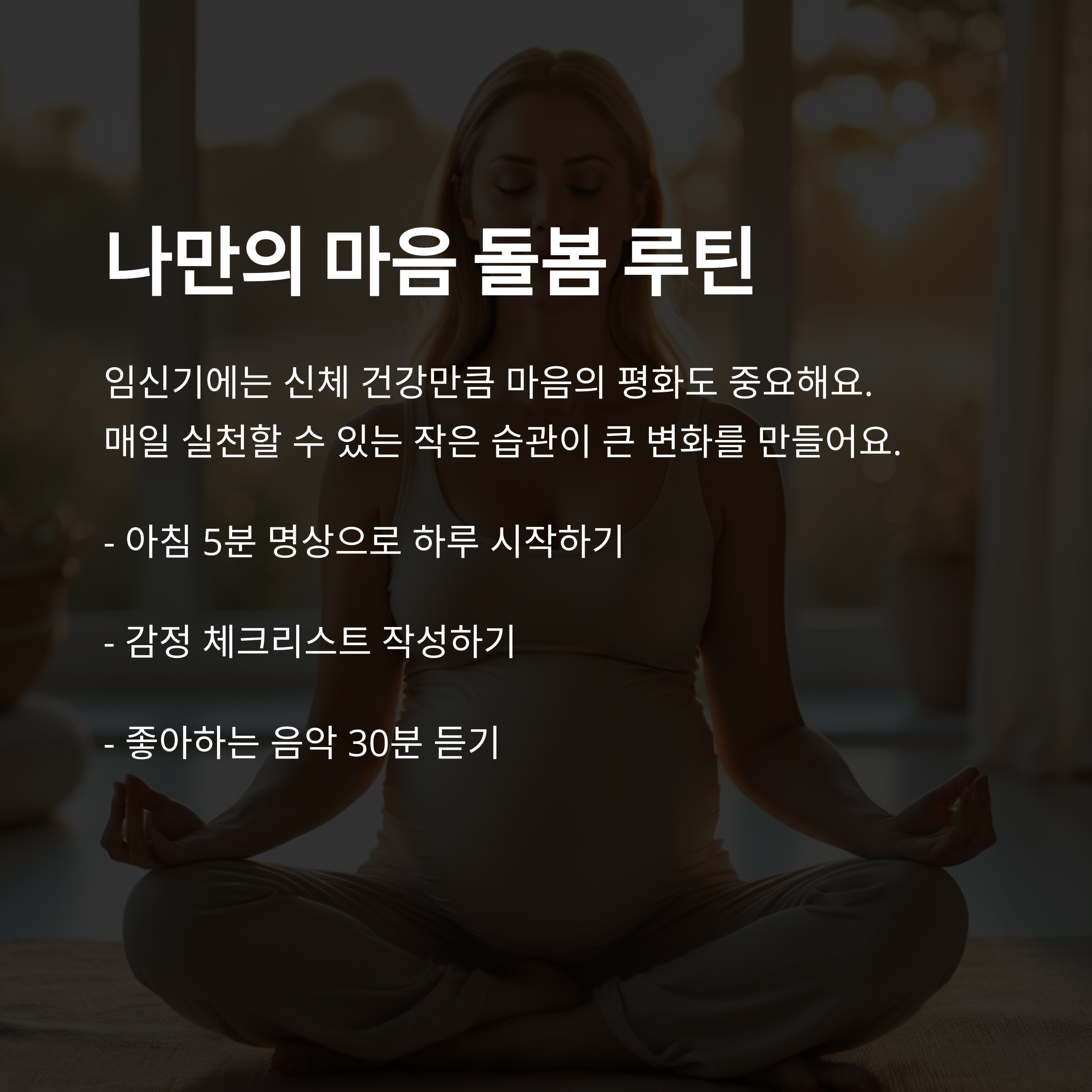 임신기에는 신체 건강만큼이나 마음의 평화도 중요해요. 매일 꾸준히 실천할 수 있는 나만의 루틴을 만들어보세요. 저는 이런 것들이 큰 도움이 됐어요: