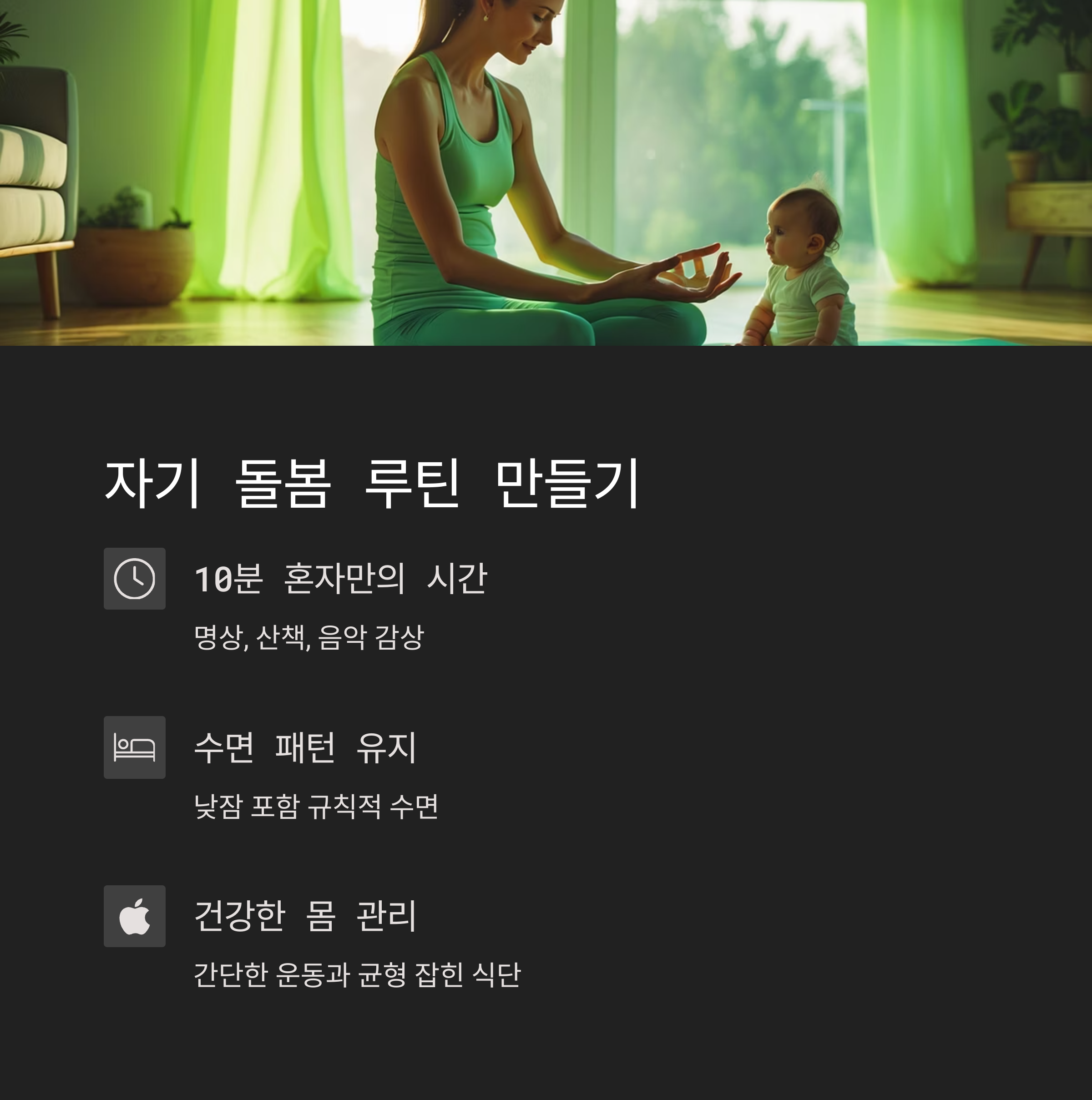 출산 후에도 ‘나’를 돌보는 일은 절대 사치가 아니에요. 오히려 더 필요한 일입니다. 자기 돌봄 루틴을 만들면 몸도 마음도 한결 가벼워질 수 있어요.