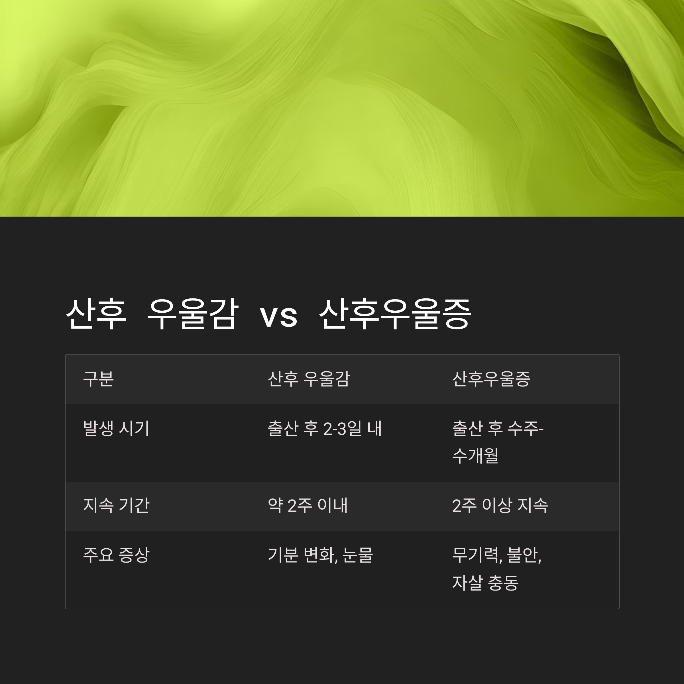 | 주요 증상 | 기분 변화, 눈물, 피로감 | 무기력, 불안, 자살 충동까지 동반 |